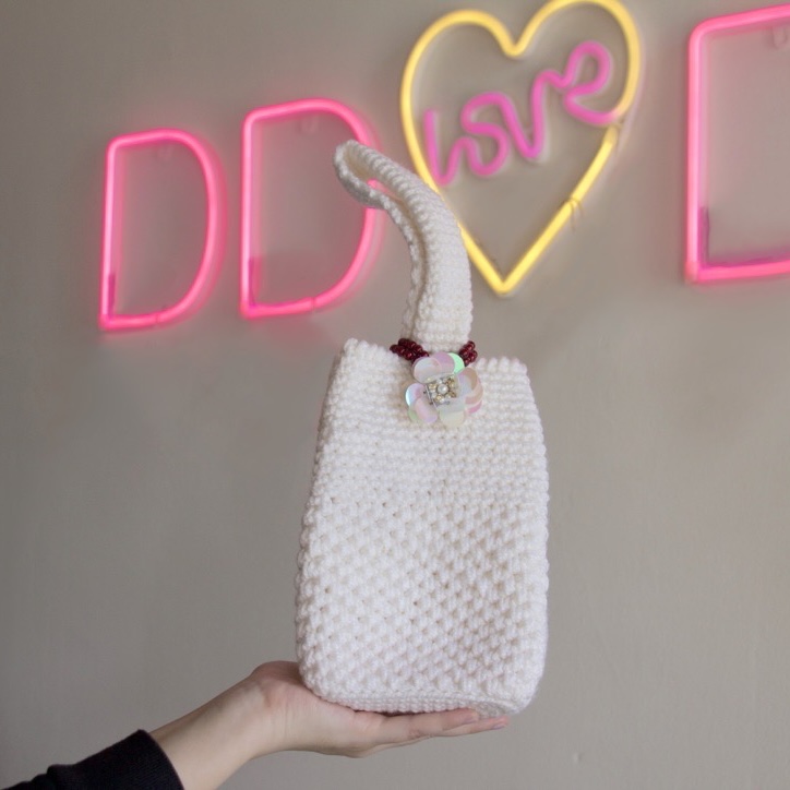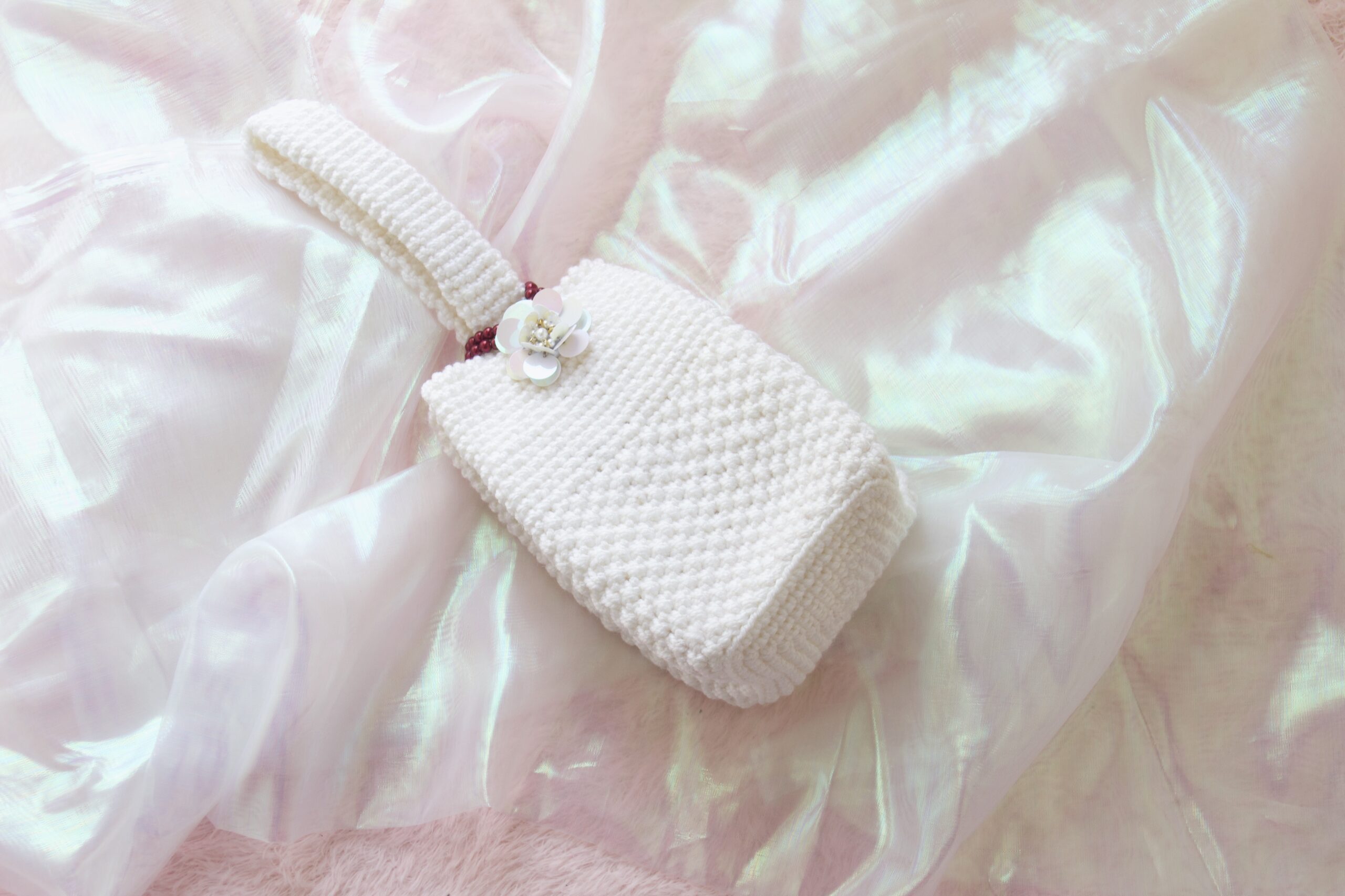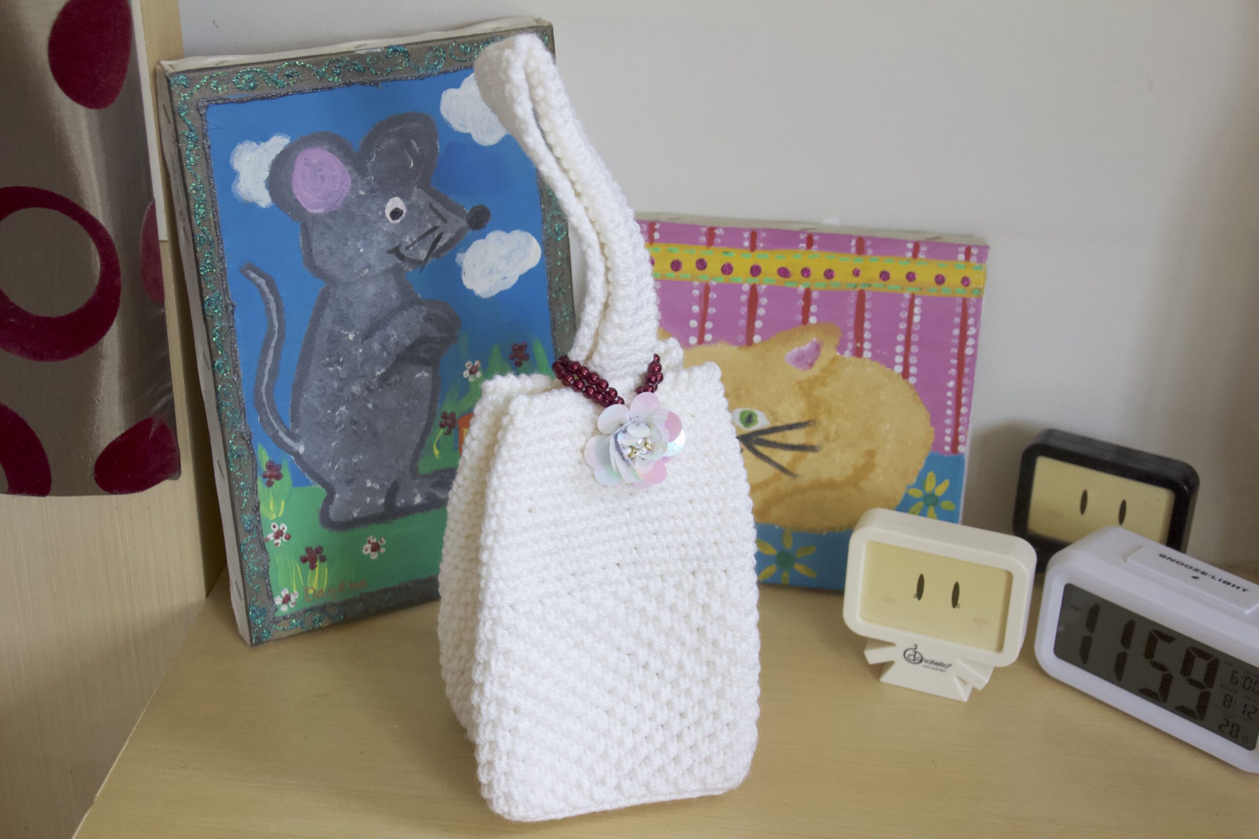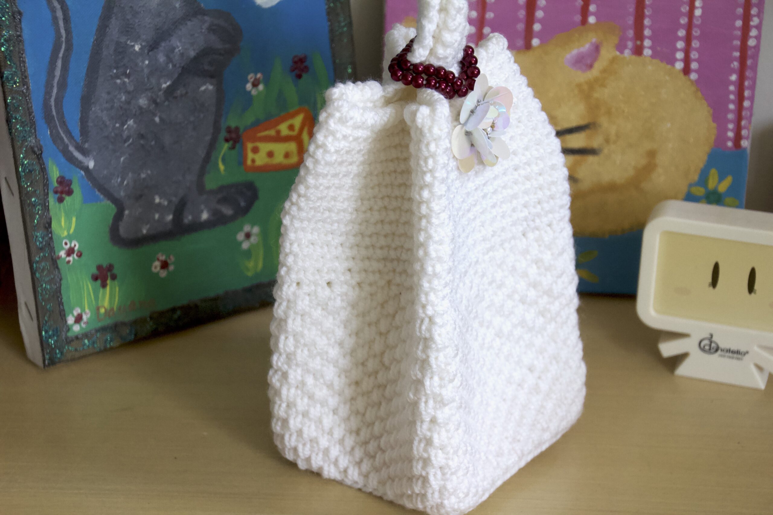 A white bold and boxy bag with pearls and flower embellishment made of carpet yarn for sturdy texture and shape.