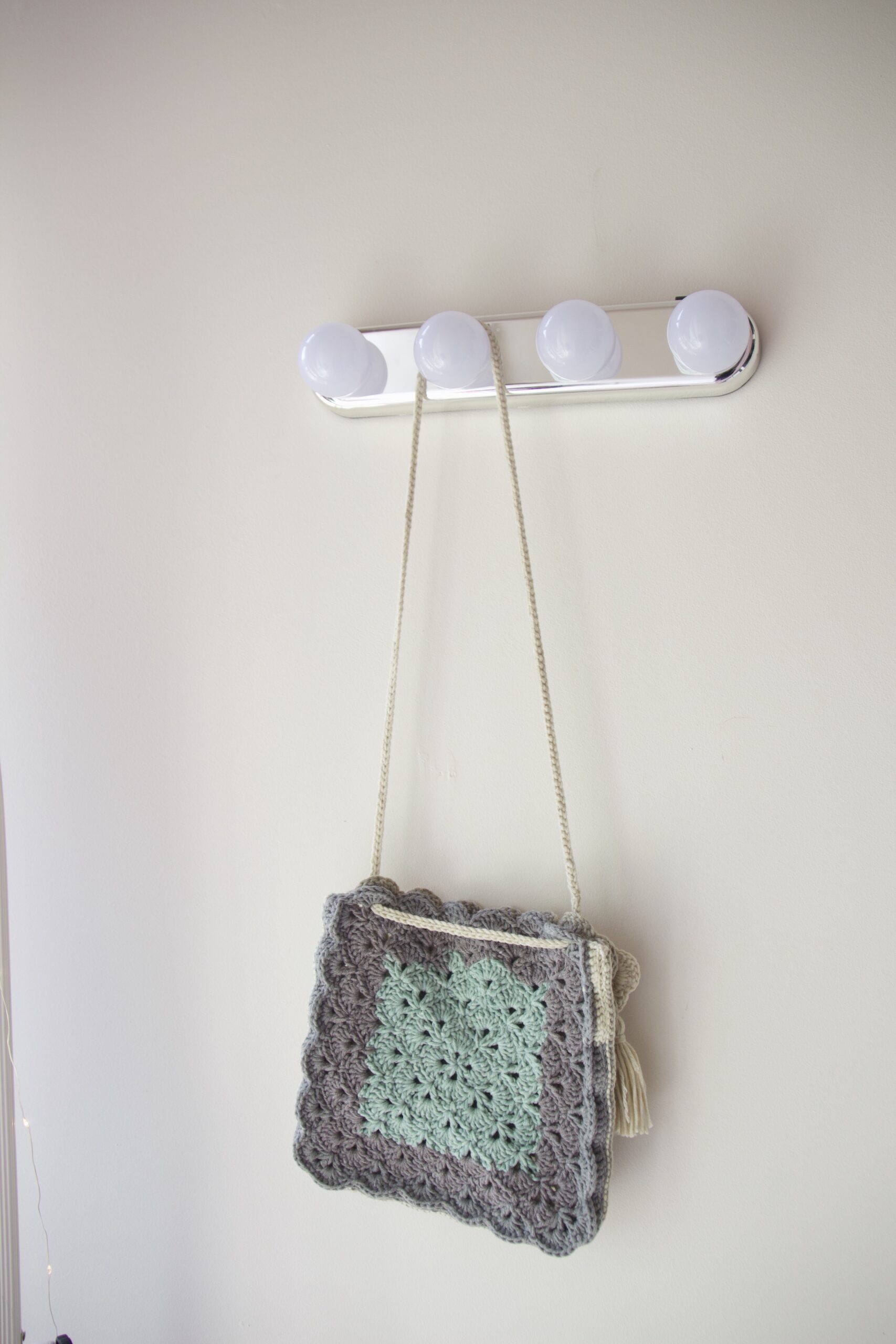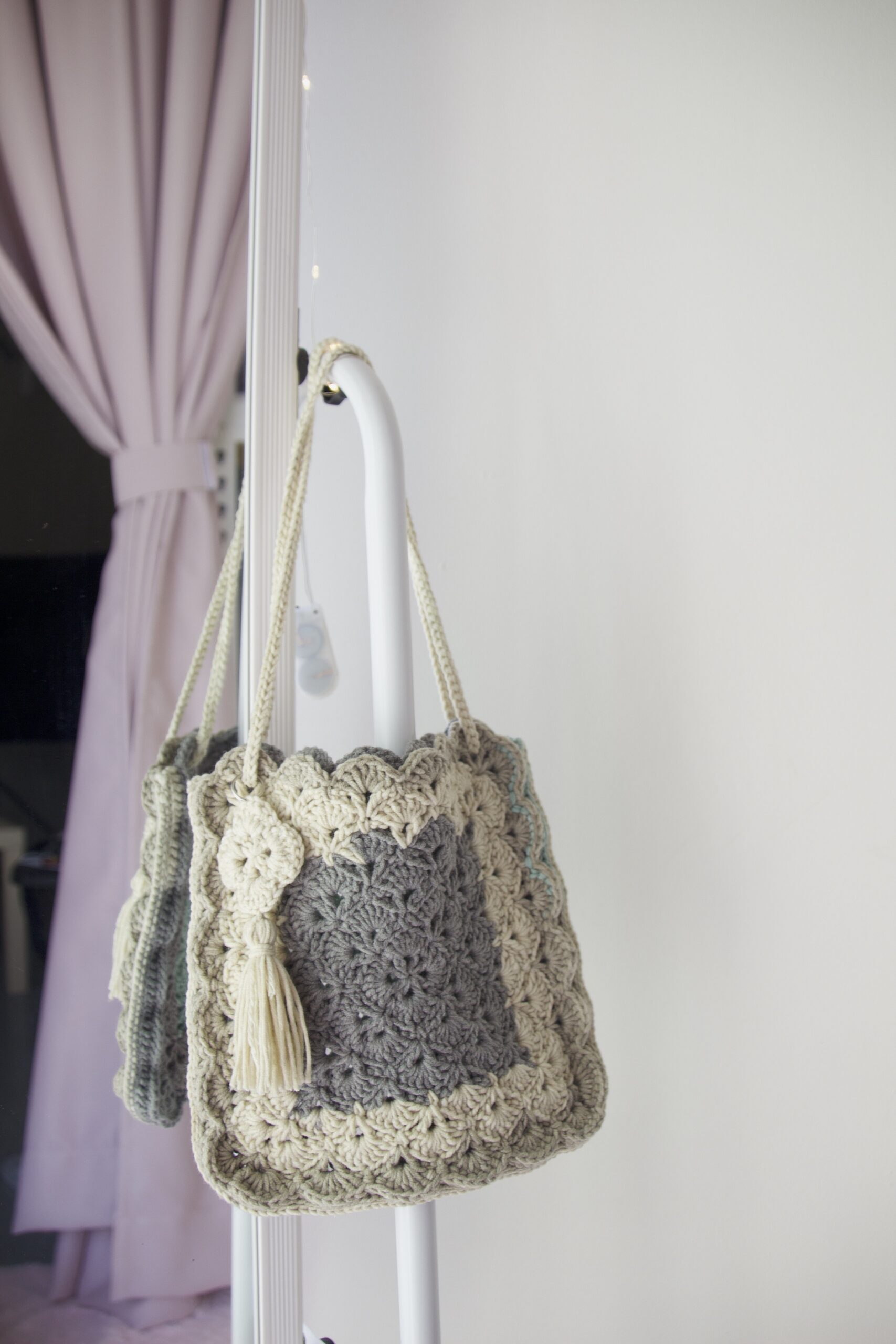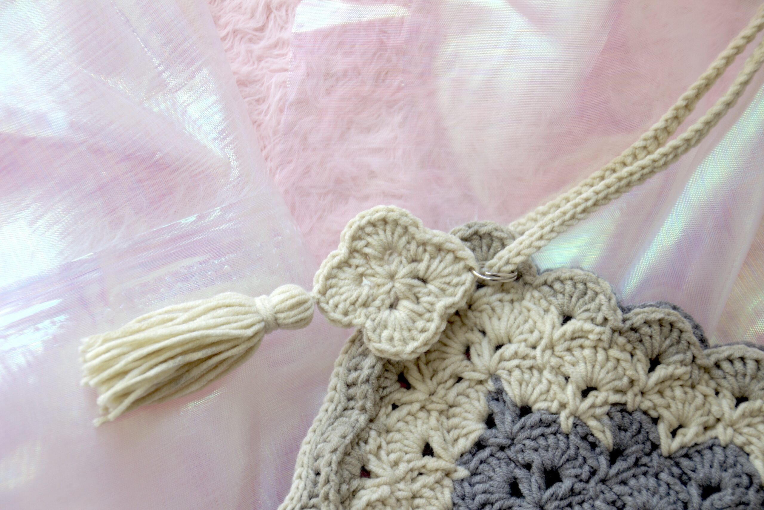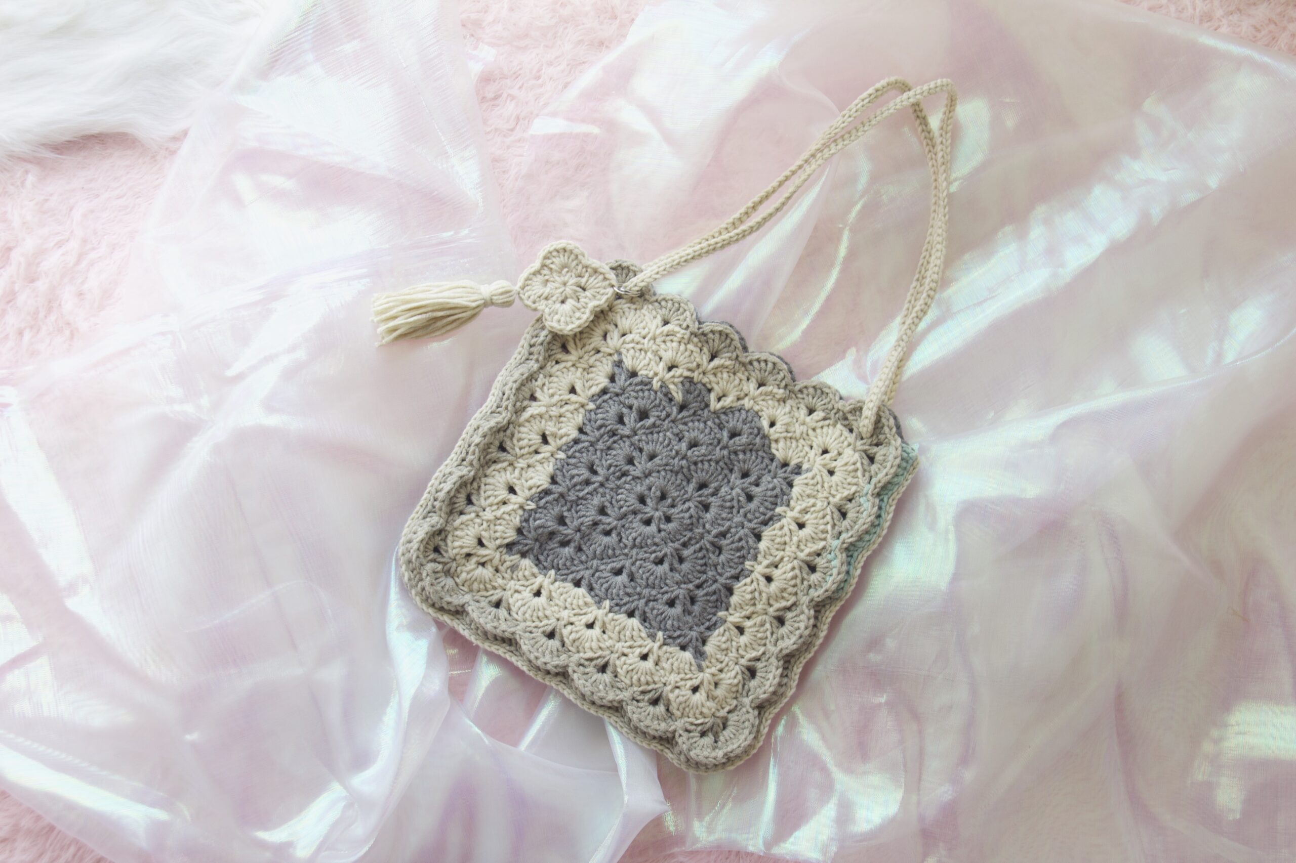 A square lacey bag with magical coloured yarn (see more in IG Highlight @ddddofficial_) that has an adjustable strap.
