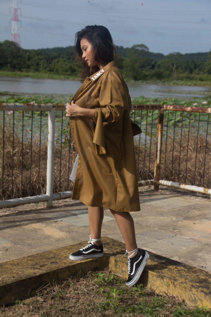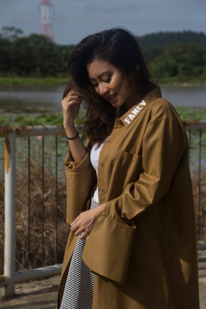 Free Size (fit XL): Bust 46″ Waist 48″ Hip 50″ Sleeve Length 25.5″ Length 37″, Knee Length Oversized Dress with ‘Fancy’ typography on the left side of the collar