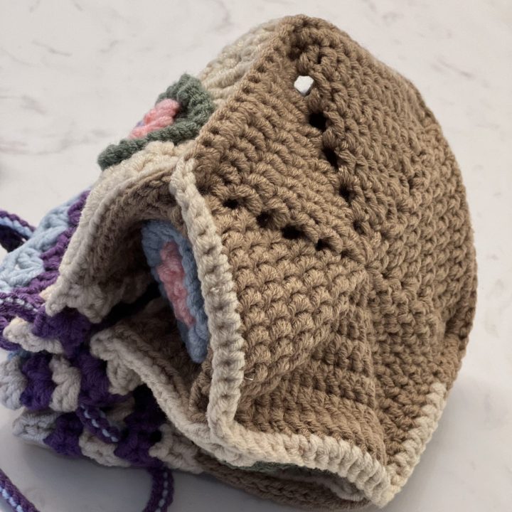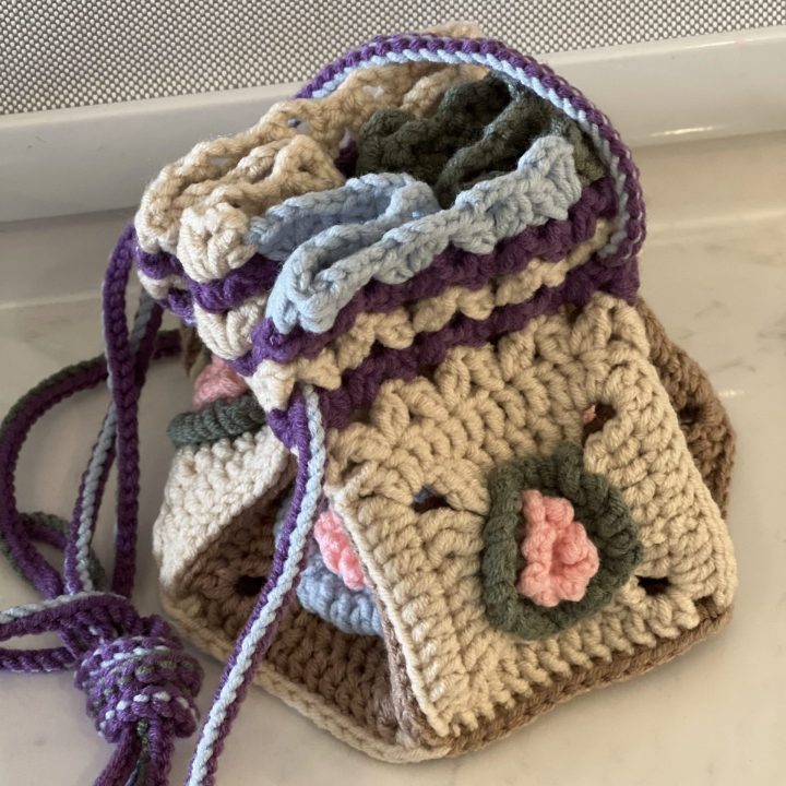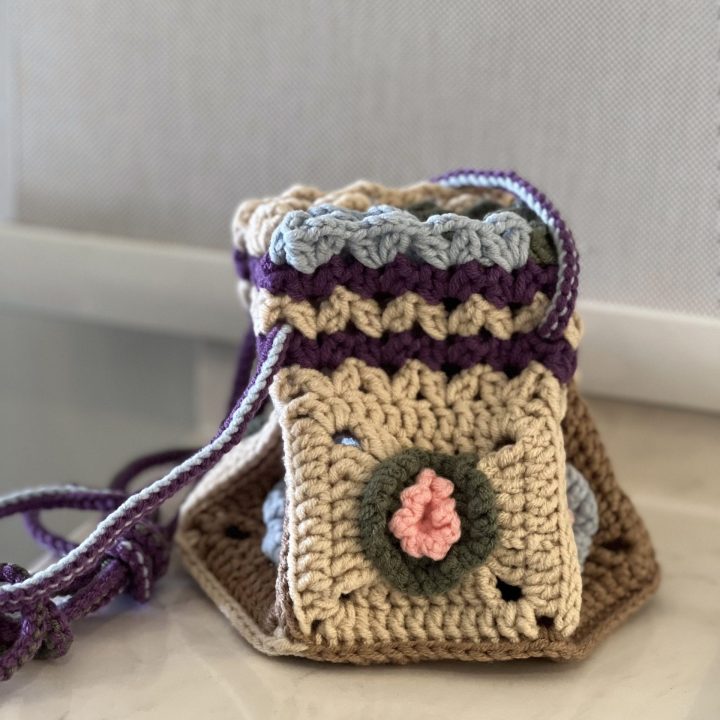 A mini bucket bag made of granny squares with a long and adjustable handle.