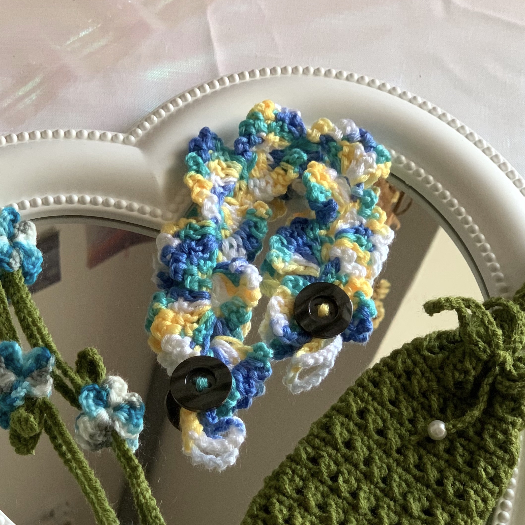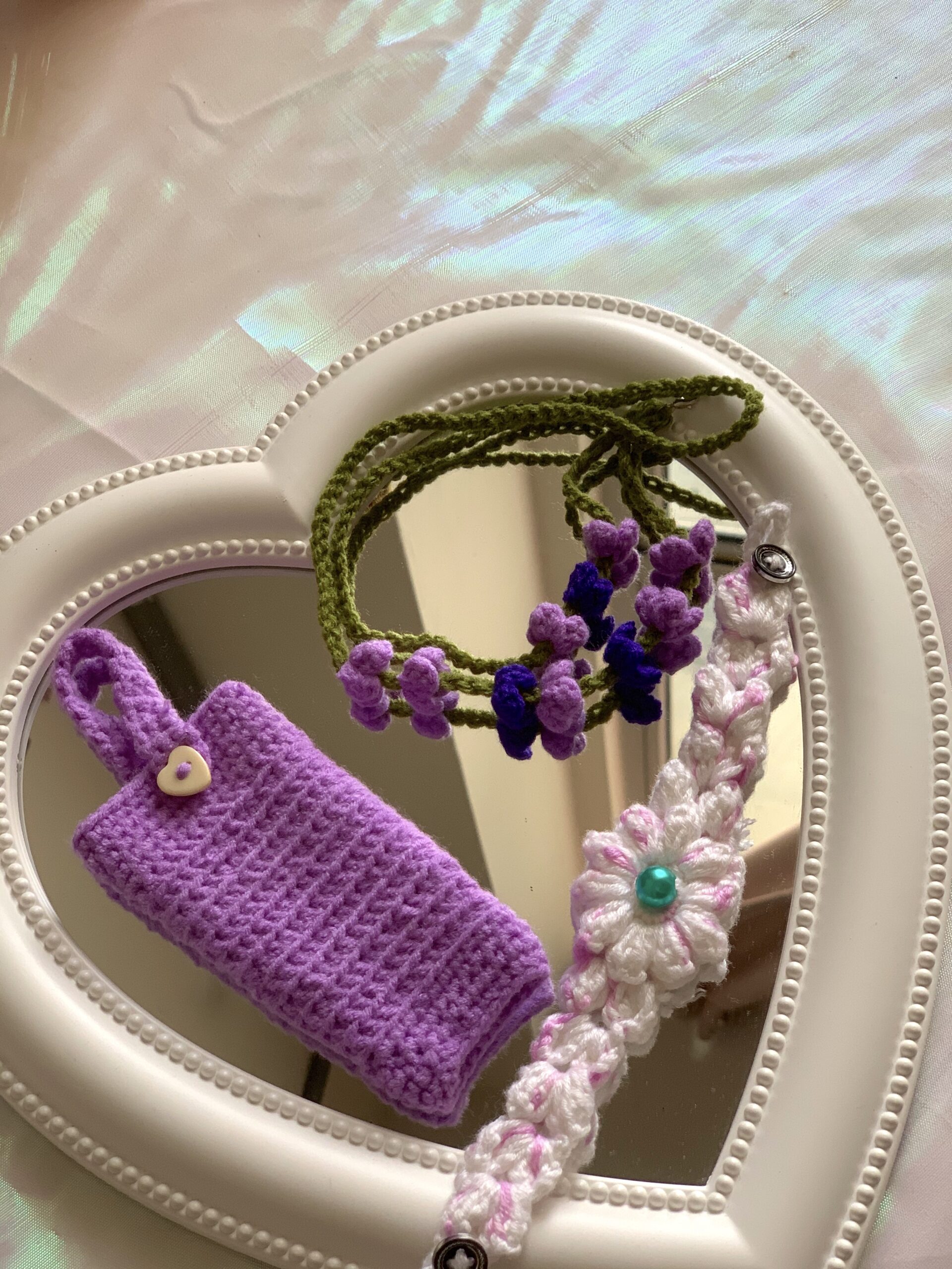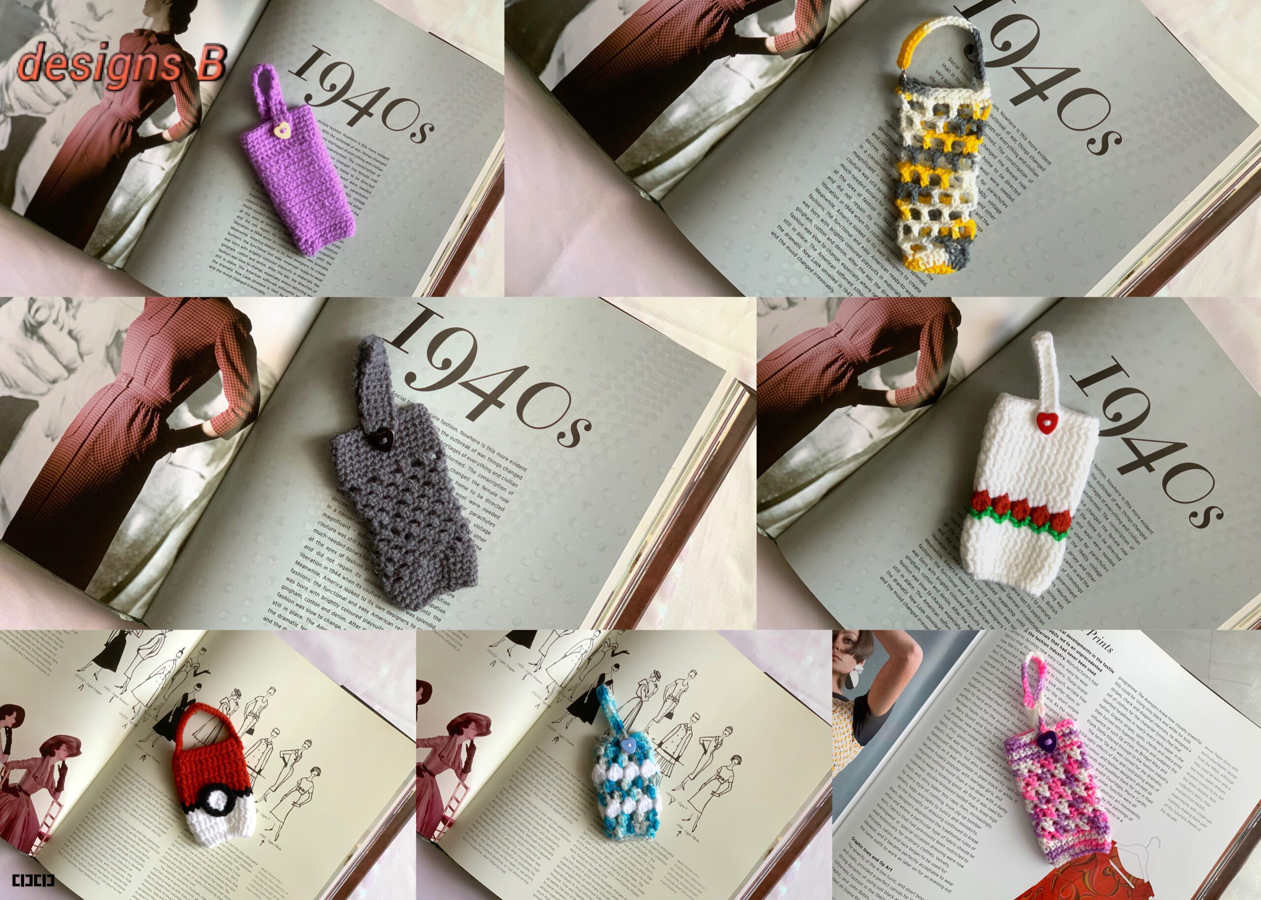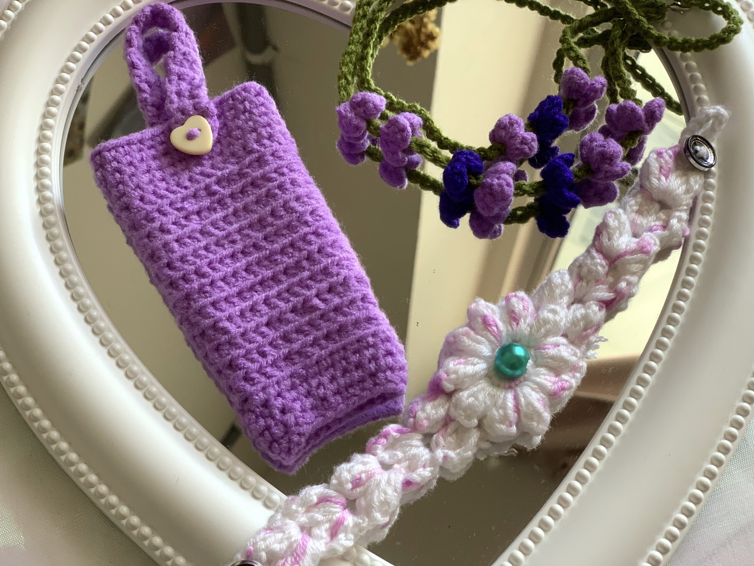 Stay Safe Kit consists of 3 handmade and crocheted items; hand sanitiser holder, mask extension and mask chain.