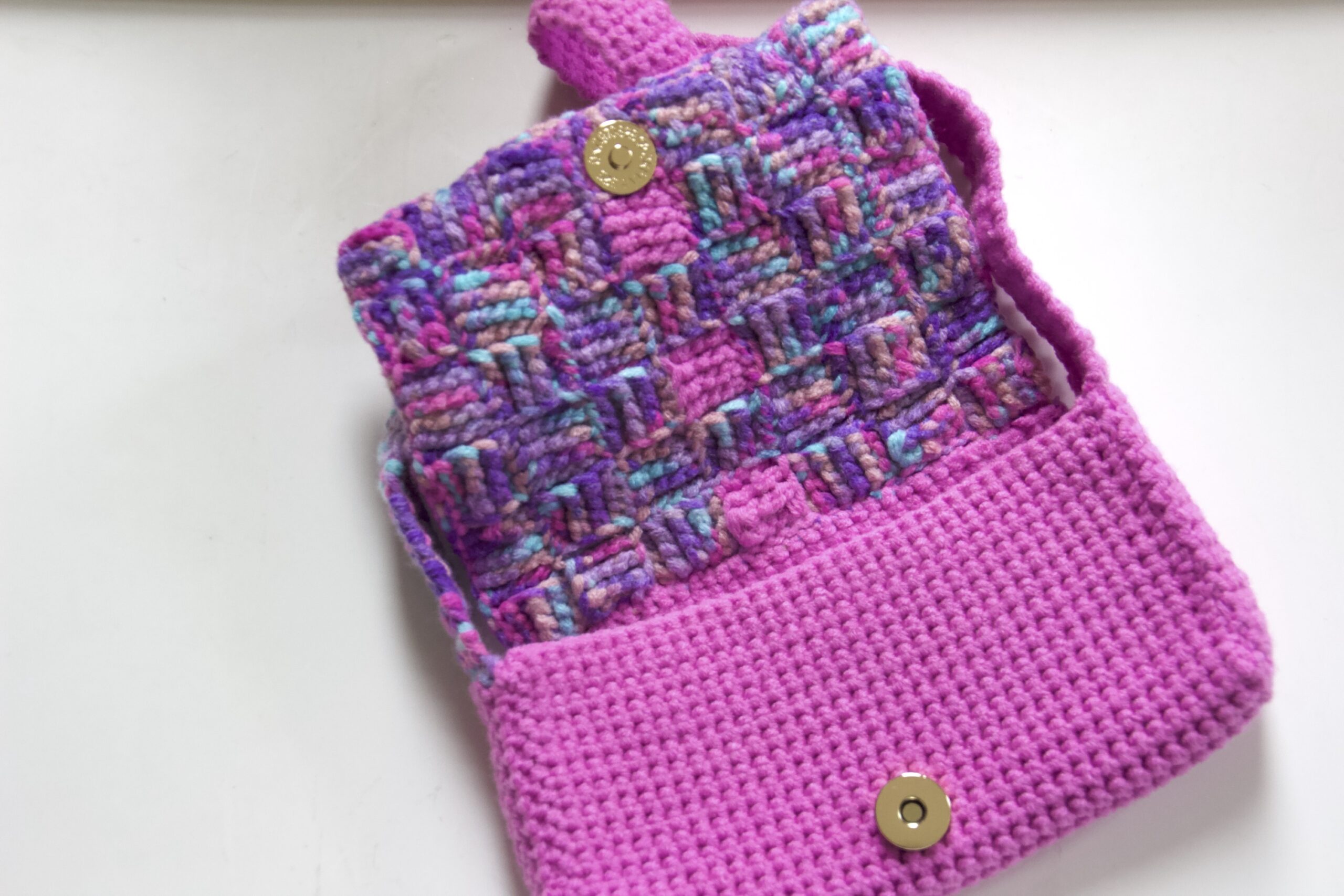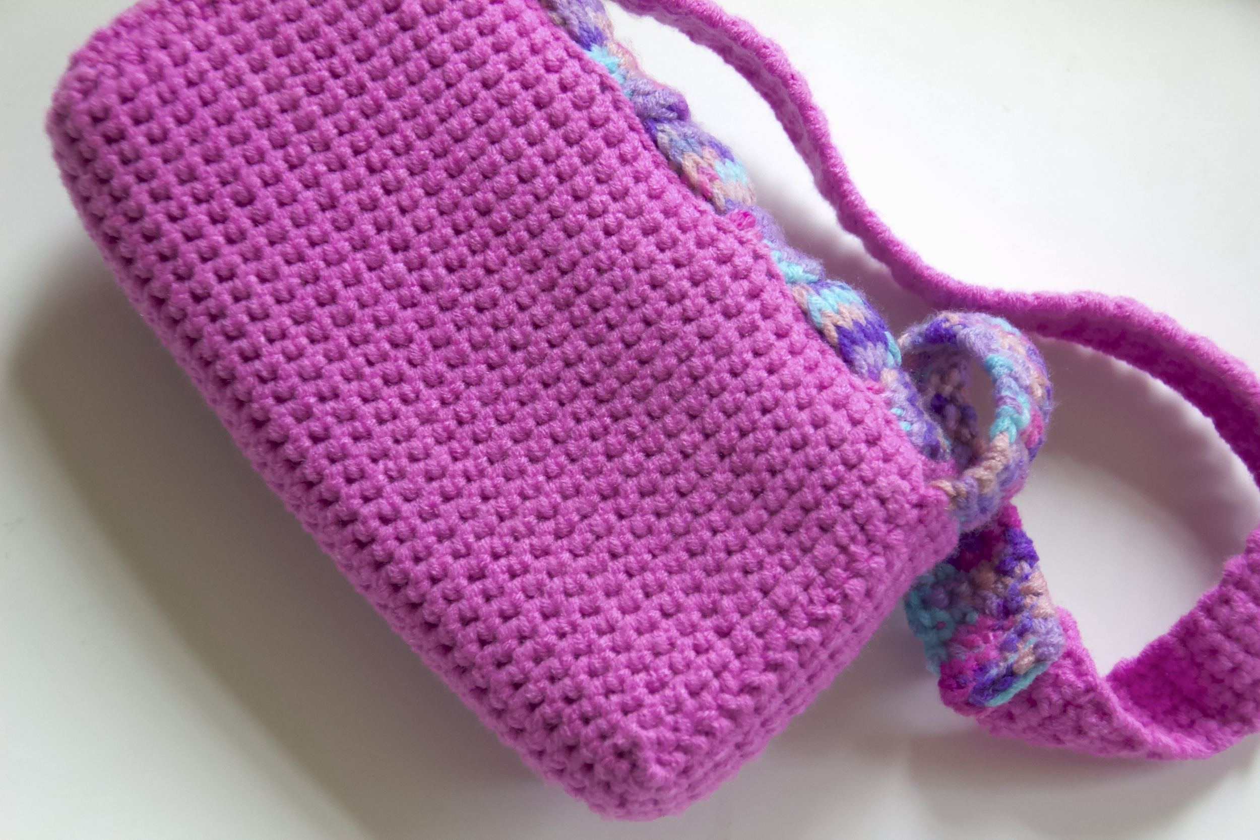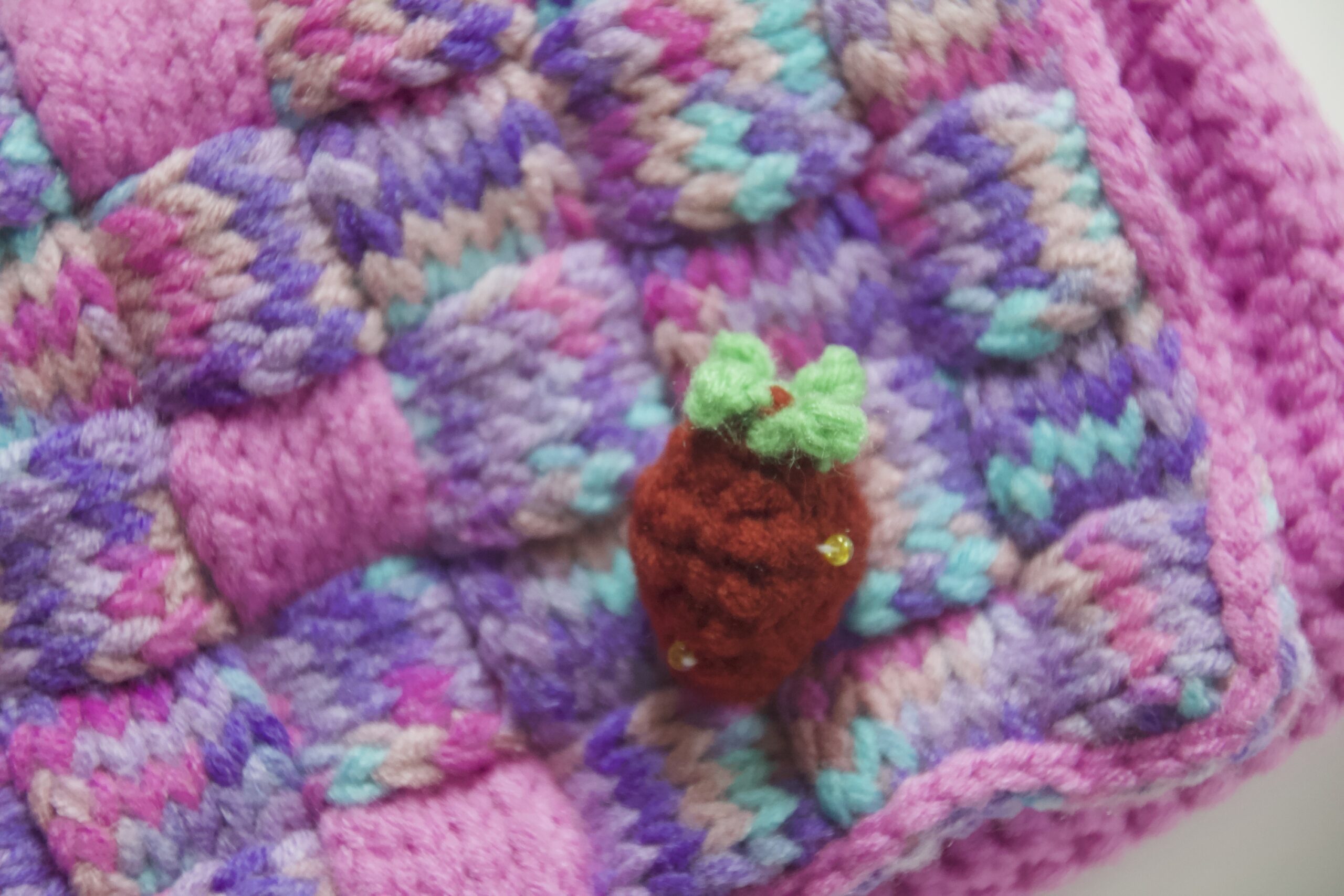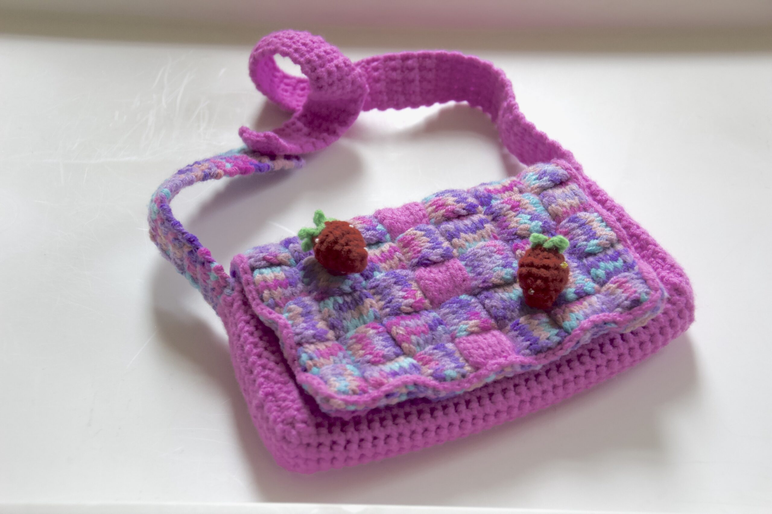 A shoulder bag made of cotton yarns and completed with cute strawberry amigurumis.