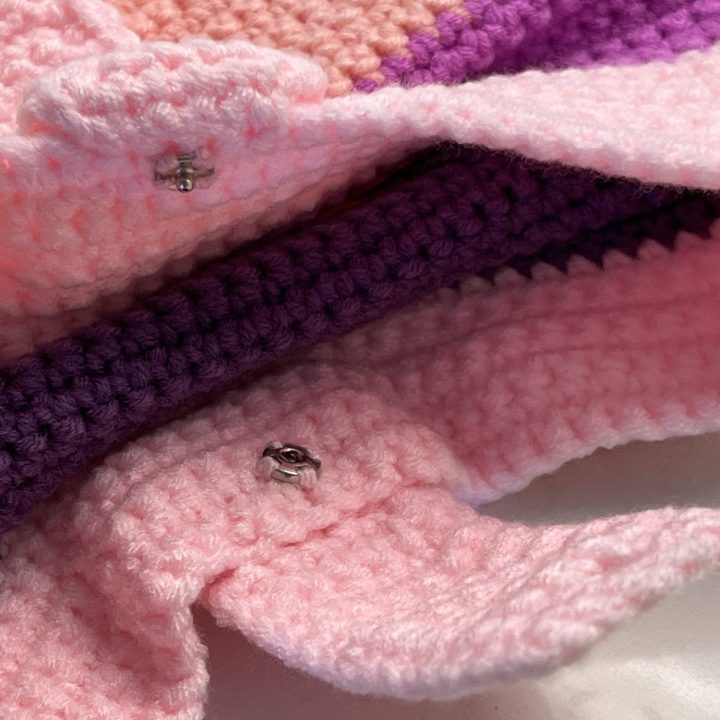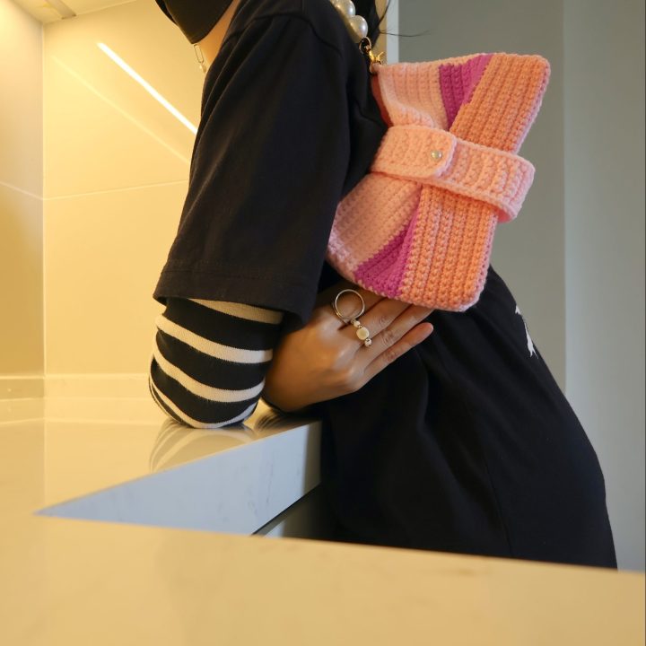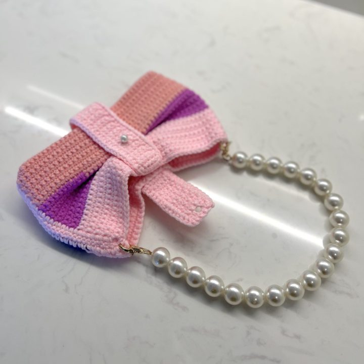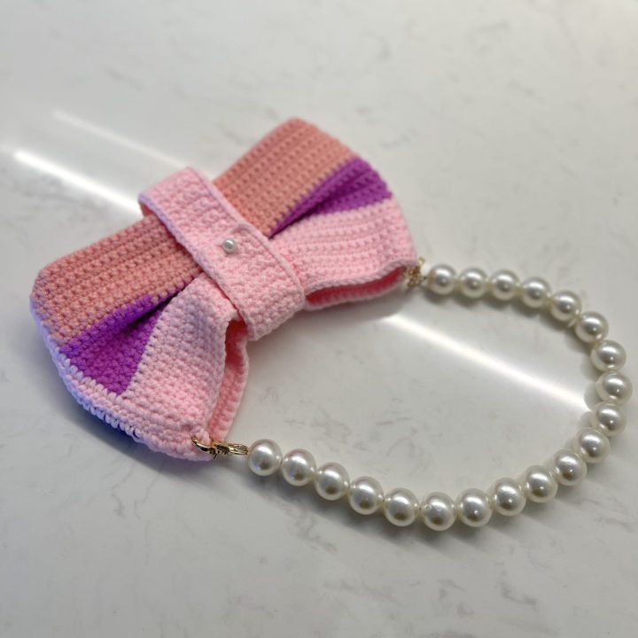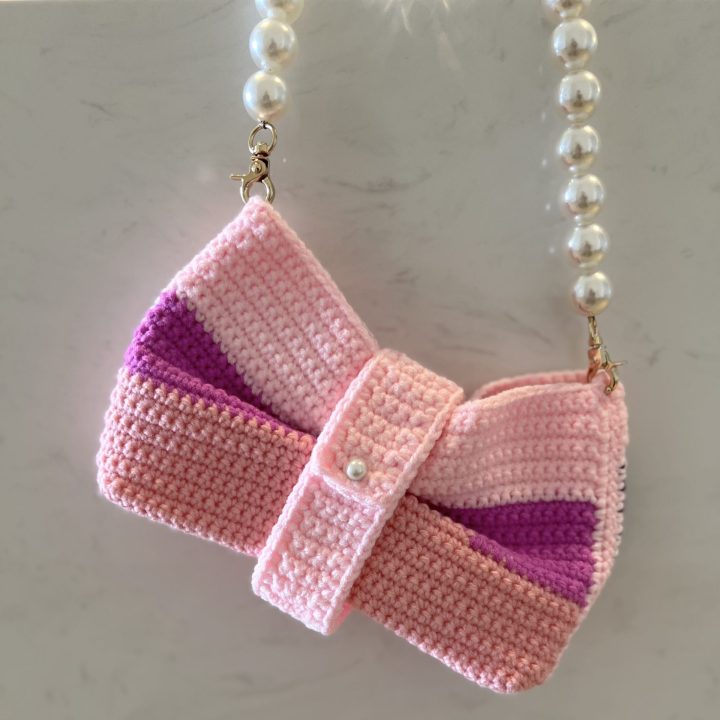 A mini bow bag with pearls handle in pink and purple stripe in front and back respectively.